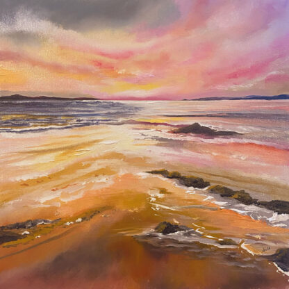 ‘Day’s End in Pink and Gold’ looks far into the distance where a vibrant sky glowing red and gold is slowly giving way to the steely grey clouds of night.