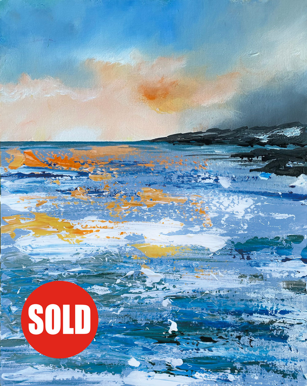 ‘Peachy Grey Skies’ is an abstract piece inspired by Winter sea colours with stunning afternoon sunsets on the water.