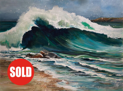 Grace and energy of one large wave as it curls sweepingly over rocks and towards the shore.